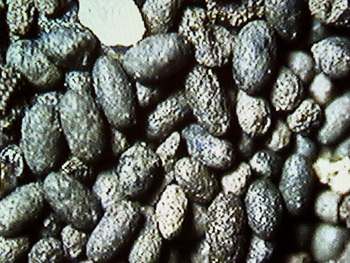 Under sigtningen af leret kan man vre heldig at gre en god "fangst" af sm fossiler. Her ses 6 resten, (en af dem ligger midt i billedet), en del mosdyr-kolonier og mange sm snegleskaller.