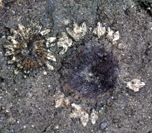 Et par dage senere blev der kigget njere p lerklumpen med kolonierne. Da de var lidt snavsede blev de renset forsigtigt med en bld pensel og noget rent vand. Lidt efter lidt dukkede der nogle "vedhng" op i kanten af en af kolonierne. (det er dem pilene p billedet peger p). Efter at have skrevet sammen med Eckart Hkansson p Geologisk Museum i Kbenhavn har vi nu fet at vide, at vi har gjort et fint lille fund. Mosdyr formerer sig bde knnet og uknnet (knopskydning) alt efter hvilket udviklingsstadie de befinder sig p. Ovenfor kan man p billedet se tre kolonier, hvorfra der skyder nye sm kolonier ud. Kolonierne er mske blevet begravet